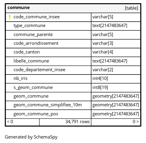 | commune__dbt_tmp_pkey1 | Primary key | Asc | code_commune_insee |