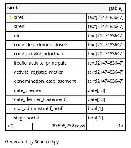 | siret__dbt_tmp_pkey | Primary key | Asc | siret |